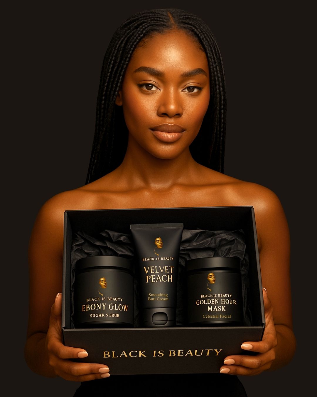 Includes: Velvet Peach Body Cream, Ebony Glow Sugar Scrub, Golden Hour Mask, Mini Affirmation Card, Bonus Ritual Card, Free gift.